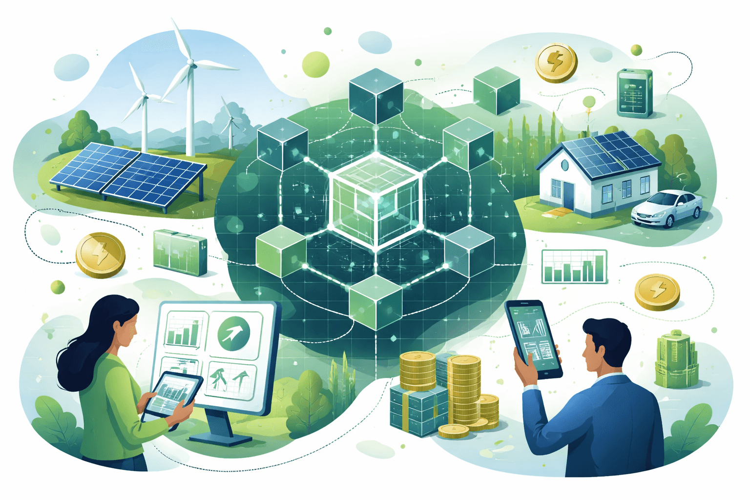 Blockchain can automate P2P energy trades and 24/7 clean energy tracking with tamper-evident records—promising faster settlement but facing scalability and regulatory hurdles.