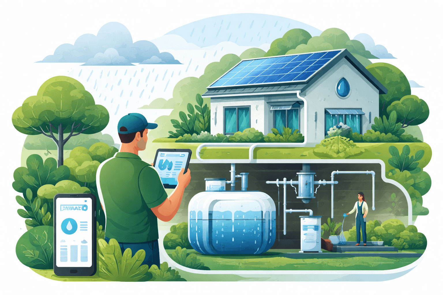 - Controls and sensors: Float/level sensors to prevent dry‑running, solenoid valves to switch to municipal backup when the tank is low, and overflow controls. Smart controllers can integrate weather forecasts to pre‑drain tanks before storms, boosting capture and flood mitigation.